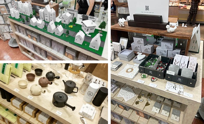 Raderの棚には街並みのように展示した人気のキャンドルホルダーやステーショナリーを、ロクサンの棚にはコーヒーやお茶のアイテムを多数取り揃えています。